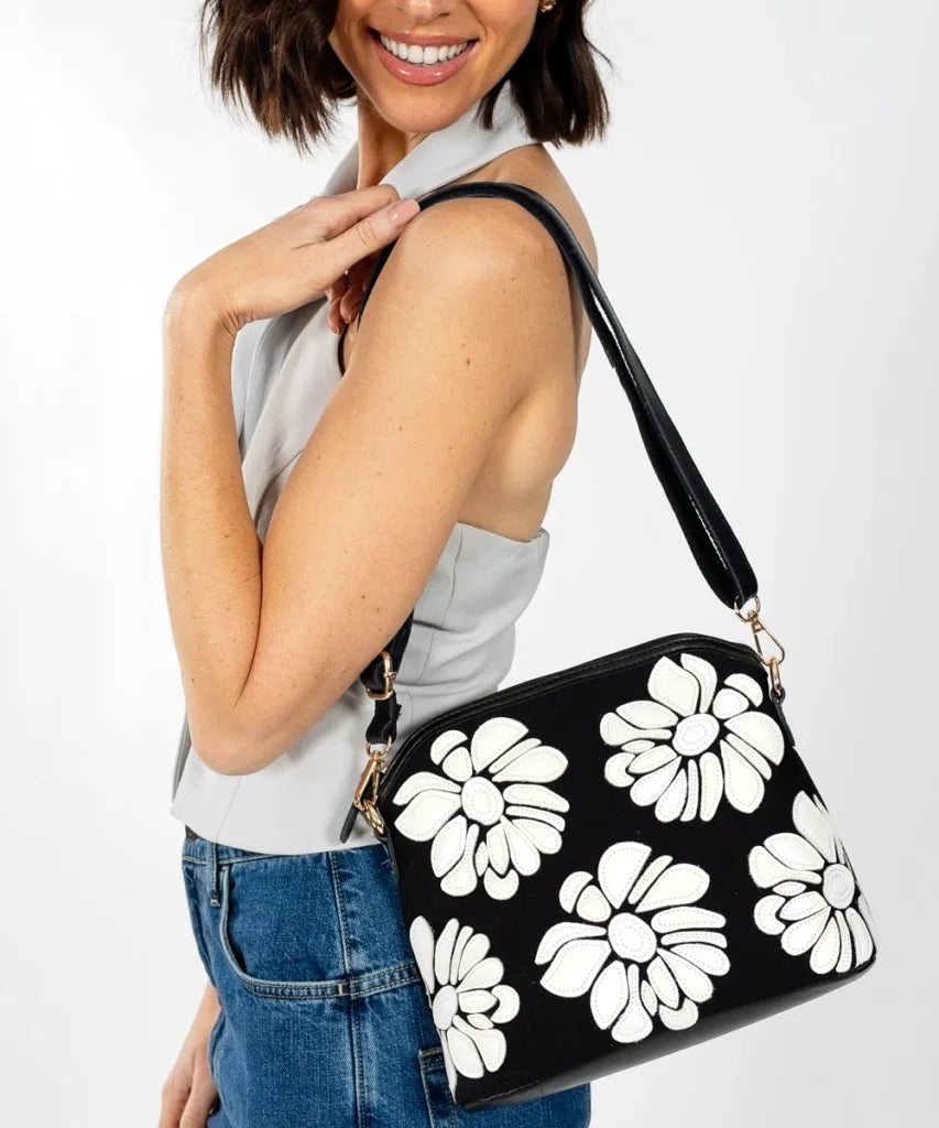 The Wild Rose Leather Cross Body Bag features a matte black cotton canvas exterior with white leather flowers stitched across the surface for a striking contrast. It includes a 135 cm crossbody strap. A zip pocket on the back offers additional storage. Finished with soft gold-tone hardware throughout. The top zip closure matches the canvas, and the interior is lined in soft beige cotton twill with one zip pocket and two open slip pockets.