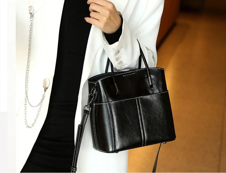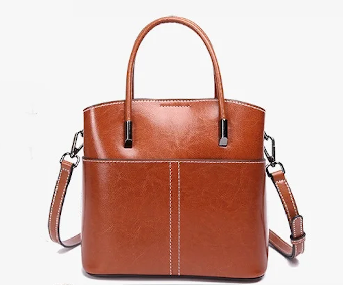 Classic leather handbag/shoulder bag/cross body bag featuring top zip closure, 2 side sections with magnetic closure, two front open pocket, stitch detail, pewter hardware and detachable/adjustable long strap. Internal zip and open pockets.