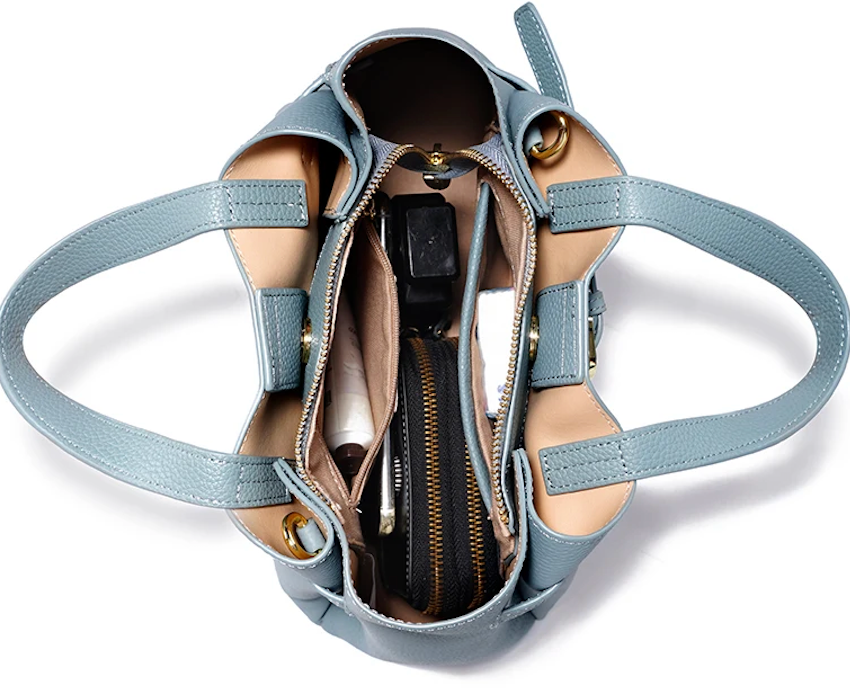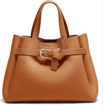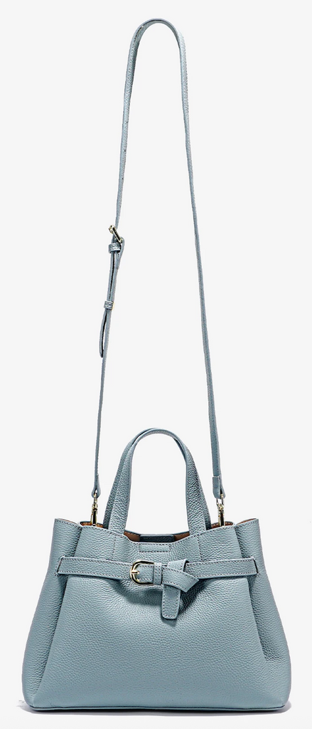 Elegant on trend soft leather 'belt' handbag, shoulder bag and cross body bag featuring top zip closure with 2 side sections with magnetic closures, silver hardware and belt detail. Interior has 3 sections with zip and open pockets.