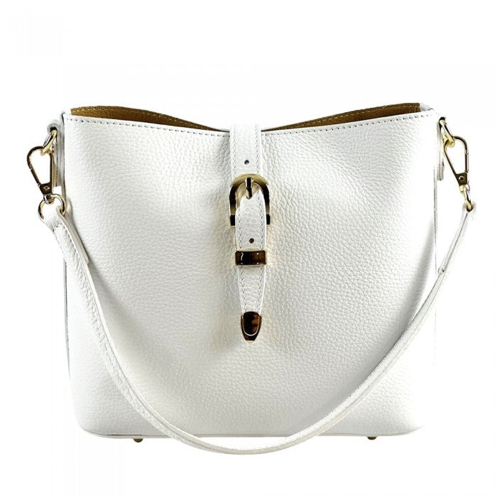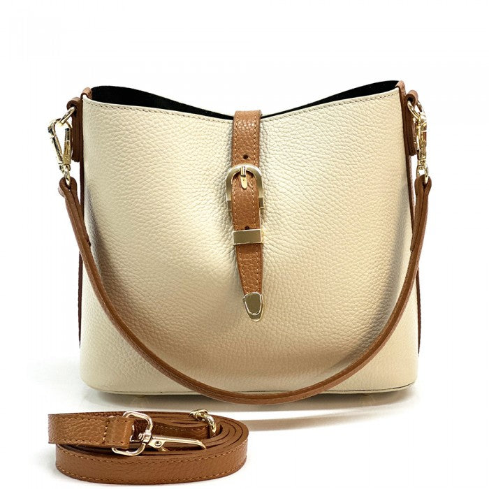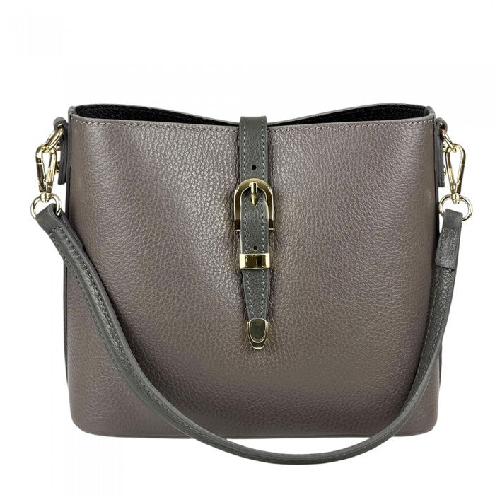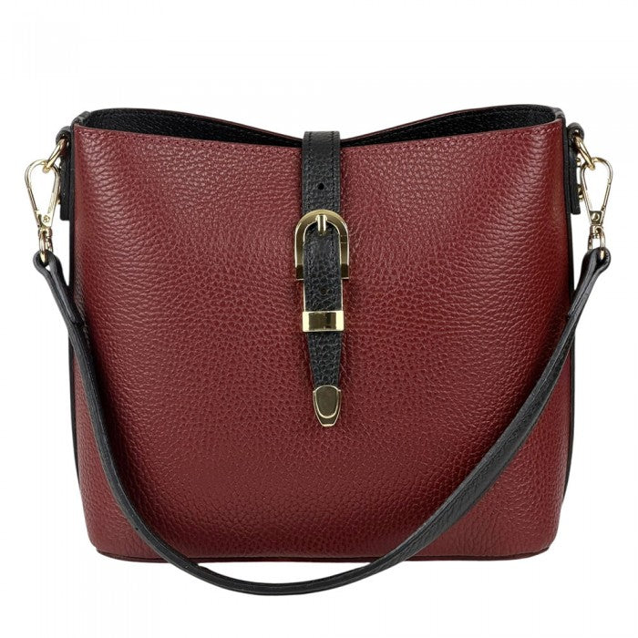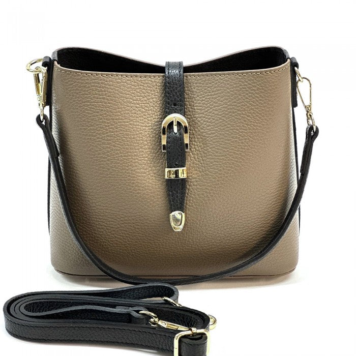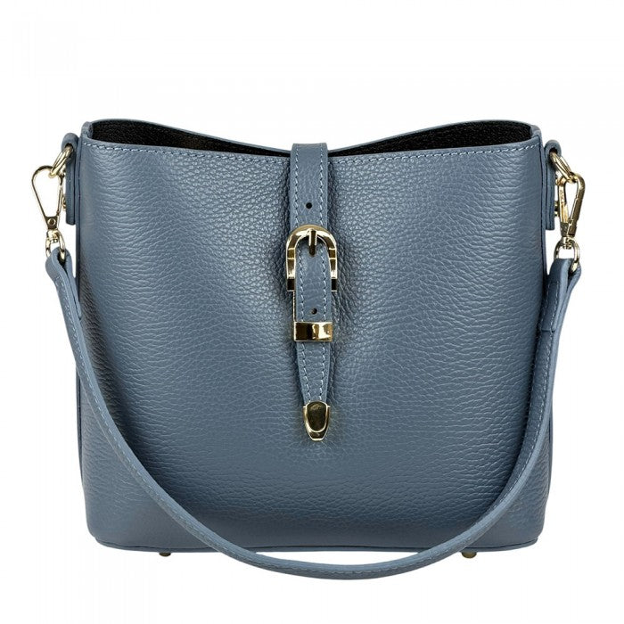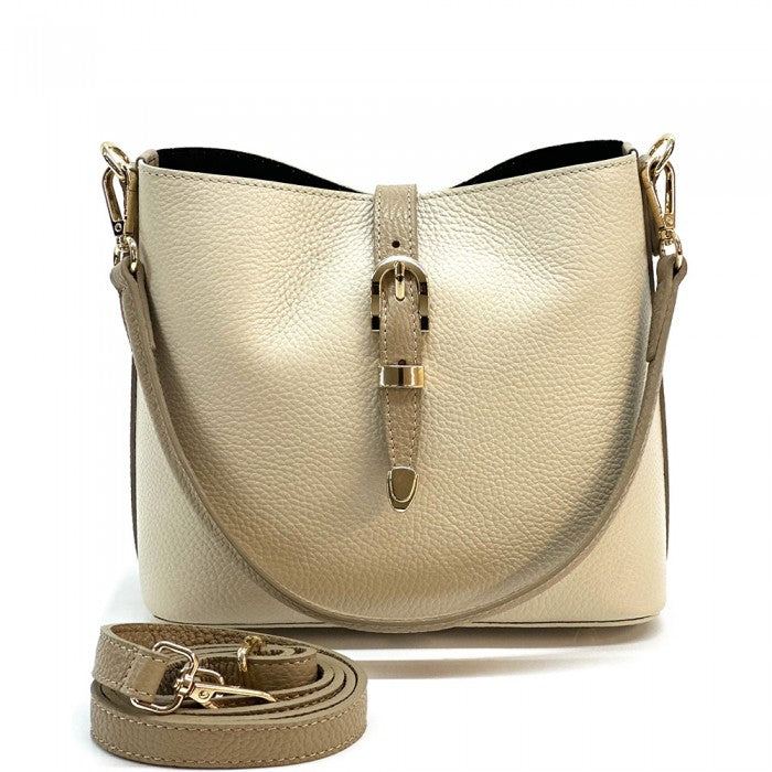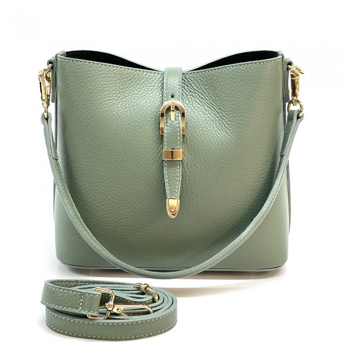 A stylish everyday Italian leather 'bucket style' shoulder/cross body bag featuring buckle magnetic closure, top zip closure, detachable short strap, detachable/adjustable long strap and gold hardware. Spacious interior for all your essentials!