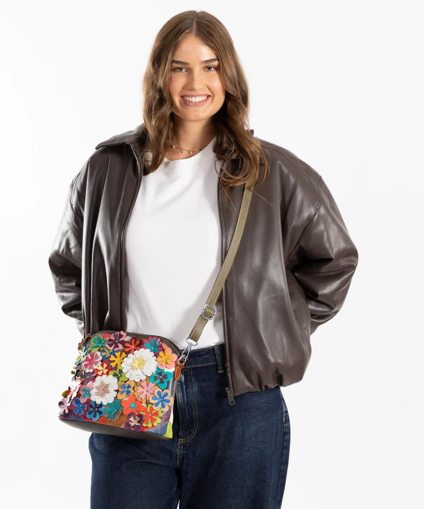 A statement leather shoulder/cross body bag featuring front encrusted with multicolour leather flowers, each with central silver stud and back is multicolour diamond leather patchwork. Back zip pocket, silver hardware with full top zip closure. Internal lined with cream polyester satin. One zip pocket on one side, open and phone pockets on other side.