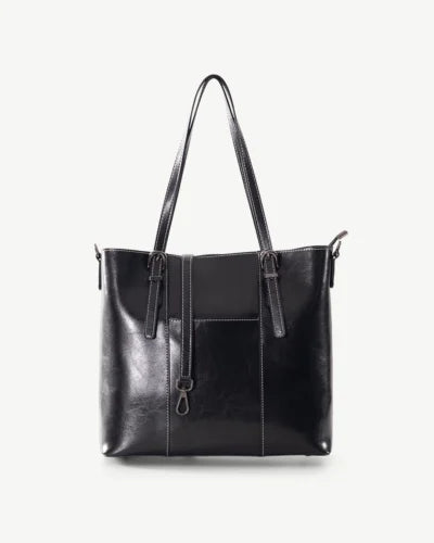 An elegant leather tote perfect for travel or work (laptop) featuring adjustable double straps to hand carry or shoulder carry together with front pocket and detachable/adjustable long cross body strap. Top zip closure with inside divider with large zip pocket, 1 small zip and 1 small open pocket.