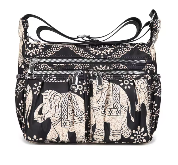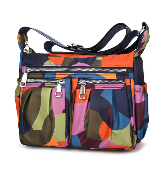 This light nylon shoulder/cross body bag is perfect for travel or every day featuring 2 front zip pockets, top zip closure and 1 back zip pocket as well as elasticised side pockets. Internal features zip and open pockets.